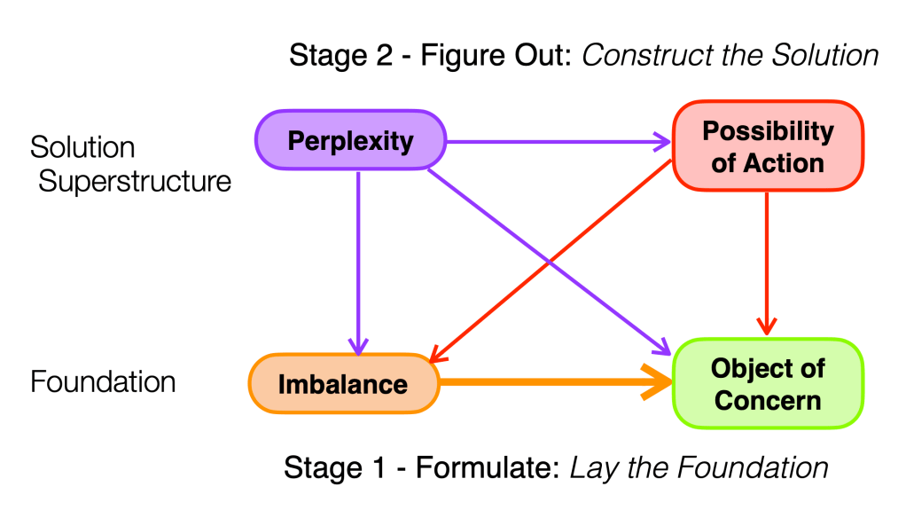 The Solution Superstructure represents the group’s plan for resolving their problem. It is the product of in-depth discussions at the table. The discussions focus on understanding the underlying Imbalances and Concerns, then devising specific Actions to eliminate those Imbalances. Constructing the Superstructure occurs in the Figure-Out stage of the problem-solving process, so Perplexity’s role is dominant. As in the simple model, Perplexity’s two main functions of understanding the Imbalance and determining an appropriate Action, remain the same. But instead of one Imbalance, the group may have many Imbalances and Actions to figure out.