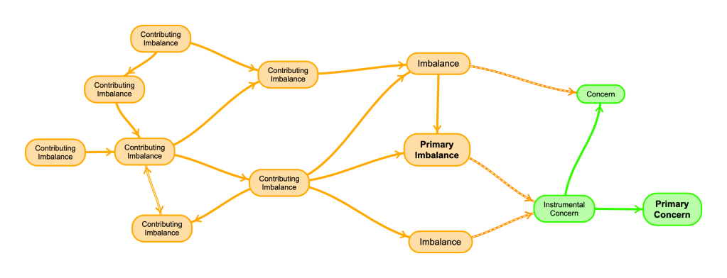 Read the Problem Foundation diagram as you would a highway map by following the arrows from one element to another. The flow of influence, from left to right, is partly set in Collaboratic’s basic problem framework where the Imbalance harms the Object of Concern. In this expanded network, Imbalances may exacerbate other Imbalances before causing harm to the Object of Concern. The flow of influence, then, propagates through the network, generally from left to right (upstream to downstream), to eventually harm an Object of Concern. If the Concerns are linked in their own network, then a Harm is transmitted from one Concern to another, possibly in the form of a disruption of support. Like a road map, the Problem Foundation diagram provides perspective, context and orientation during deliberations and subsequent remedial actions.